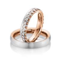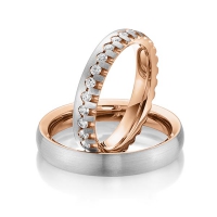 Set Memoire-trouwringen van Steinberg in buiten grijsgoud 14 kt. , binnen roségoud 14 kt. Oppervlakte: gematteerd , gepolijst met in totaal 0,85 ct. Briljant tw/si (Product 1 met steenzetting Product 2 zonder steenzetting)
