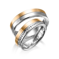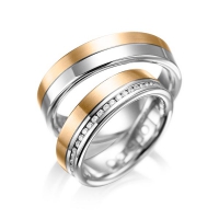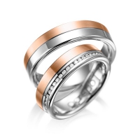 Set Memoire-trouwringen van acredo in grijsgoud 14 kt. roodgoud 14 kt. Oppervlakte: gepolijst, gematteerd met in totaal 0,47 ct. Briljant tw/si (Product 1 met steenzetting Product 2 zonder steenzetting)