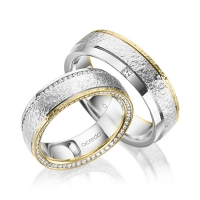 Set Memoire-trouwringen van acredo in witgoud 14 kt. geelgoud 14 kt. Oppervlakte: gepolijst, crushed met in totaal 0,6 ct. Briljant & Princess-Diamant tw/si