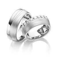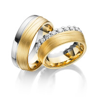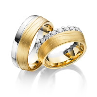 Set Memoire-trouwringen van Steinberg in witgoud 14 kt. geelgoud 14 kt. Oppervlakte: gepolijst, zandmat fijn met in totaal 1,84 ct. Briljant tw/si (Product 1 met steenzetting Product 2 zonder steenzetting)