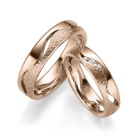Set trouwringen van Merii in 600/- Platinahoudend metaal (60%) roségoud 14 kt. Oppervlakte: gepolijst, hamerslag met in totaal 0,036 ct. Briljant tw/si (Product 1 met steenzetting Product 2 zonder steenzetting)