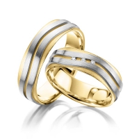 Set trouwringen van Steinberg in buiten grijsgoud 14 kt. , binnen geelgoud 14 kt. Oppervlakte: zoals model met in totaal 0,03 ct. Briljant tw/si (Product 1 met steenzetting Product 2 zonder steenzetting)