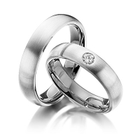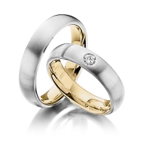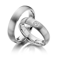 Set trouwringen van Steinberg in buiten witgoud 14 kt. , binnen dark grey gold 14 kt. Oppervlakte: gematteerd , gepolijst met in totaal 0,17 ct. Briljant tw/si (Product 1 met steenzetting Product 2 zonder steenzetting)