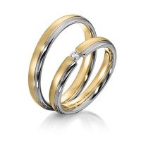 Set trouwringen van acredo in geelgoud 14 kt. grijsgoud 14 kt. Oppervlakte: gematteerd , gepolijst met in totaal 0,05 ct. Briljant tw/si (Product 1 met steenzetting Product 2 zonder steenzetting)