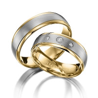 Set trouwringen van Steinberg in geelgoud 14 kt. grijsgoud 14 kt. Oppervlakte: gepolijst, gematteerd met in totaal 0,08 ct. Briljant tw/si (Product 1 met steenzetting Product 2 zonder steenzetting)