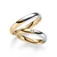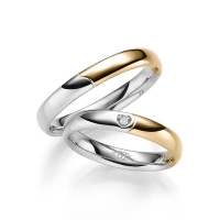 Set trouwringen in geelgoud 14 kt. witgoud 14 kt. Oppervlakte: gepolijst met in totaal 0,015 ct. Briljant tw/si (Product 1 met steenzetting Product 2 zonder steenzetting)