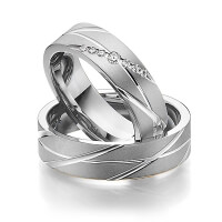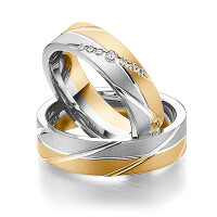 Set trouwringen van Steinberg in geelgoud 14 kt. witgoud 14 kt. Oppervlakte: zandmat fijn met in totaal 0,09 ct. Briljant tw/si (Product 1 met steenzetting Product 2 zonder steenzetting)