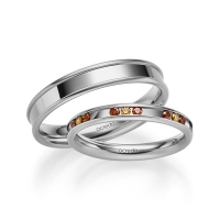 Set trouwringen van acredo in geelgoud 14 kt. witgoud 14 kt. Oppervlakte: gepolijst met in totaal 0,42 ct. Briljant Cognac Red Cherry (Product 1 met steenzetting Product 2 zonder steenzetting)