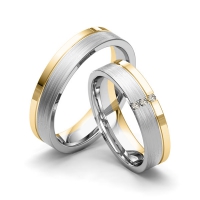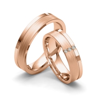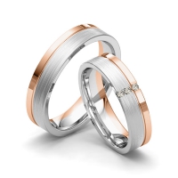 Set trouwringen van Merii in grijsgoud 14 kt. roodgoud 14 kt. Oppervlakte: gematteerd , gepolijst met in totaal 0,03 ct. Briljant tw/si (Product 1 met steenzetting Product 2 zonder steenzetting)