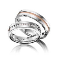 Set trouwringen van Steinberg in grijsgoud 14 kt. roodgoud 14 kt. Oppervlakte: gepolijst, zandmat fijn met in totaal 0,15 ct. Briljant tw/si (Product 1 met steenzetting Product 2 zonder steenzetting)