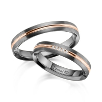 Set trouwringen in inside Tantalum , outside Tantalum roodgoud 18 kt. Oppervlakte: gepolijst, gematteerd met in totaal 0,025 ct. Briljant tw/si (Product 1 met steenzetting Product 2 zonder steenzetting)