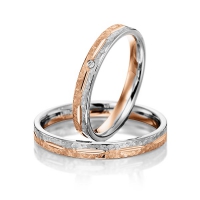 Set trouwringen van Merii in rood 9 kt. goudhoudend metaal (37,5%) wit 9 kt. goudhoudend metaal (37,5%) Oppervlakte: crushed ice met in totaal 0,01 ct. Briljant tw/si (Product 1 met steenzetting Product 2 zonder steenzetting)