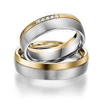 Set trouwringen van acredo in roodgoud 14 kt. grijsgoud 14 kt. Oppervlakte: gepolijst, gematteerd met in totaal 0,04 ct. Briljant tw/si (Product 1 met steenzetting Product 2 zonder steenzetting)