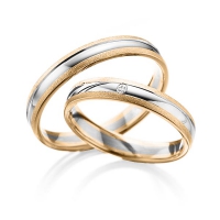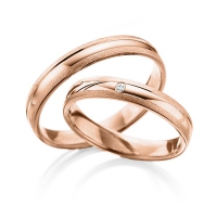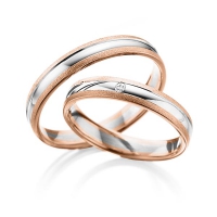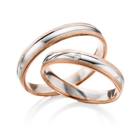 Set trouwringen van Steinberg in roodgoud 14 kt. witgoud 14 kt. Oppervlakte: zandmat fijn, gepolijst met in totaal 0,015 ct. Briljant tw/si (Product 1 met steenzetting Product 2 zonder steenzetting)