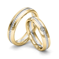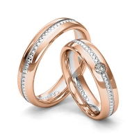Set trouwringen van acredo in roodgoud 14 kt. witgoud 14 kt. Oppervlakte: gepolijst met in totaal 0,08 ct. Briljant tw/si (Product 1 met steenzetting Product 2 zonder steenzetting)