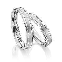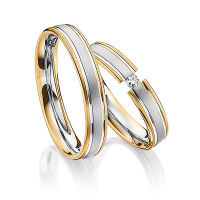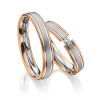 Set trouwringen van Steinberg in roségoud 14 kt. grijsgoud 14 kt. Oppervlakte: zandmat fijn met in totaal 0,04 ct. Briljant tw/si (Product 1 met steenzetting Product 2 zonder steenzetting)