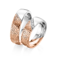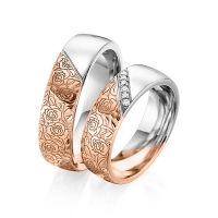 Set trouwringen van Eternal Touch in roségoud 14 kt. witgoud 14 kt. Oppervlakte: gepolijst met in totaal 0,06 ct. Briljant tw/si (Product 1 met steenzetting Product 2 zonder steenzetting)
