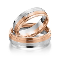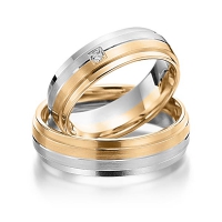 Set trouwringen van Steinberg in witgoud 14 kt. geelgoud 14 kt. Oppervlakte: zoals model met in totaal 0,03 ct. Briljant tw/si (Product 1 met steenzetting Product 2 zonder steenzetting)