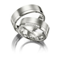 Set trouwringen van Merii in witgoud 14 kt. roodgoud 14 kt. Oppervlakte: gematteerd , gepolijst met in totaal 0,07 ct. Briljant tw/si (Product 1 met steenzetting Product 2 zonder steenzetting)