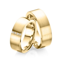 Set trouwringen van Steinberg in geelgoud 14 kt. Oppervlakte: gematteerd met in totaal 0,12 ct. Princess-Diamant tw/si (Product 1 met steenzetting Product 2 zonder steenzetting)