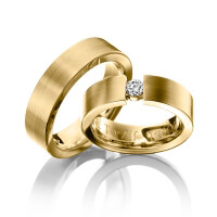 Set trouwringen van Eternal Touch in geelgoud 14 kt. Oppervlakte: gematteerd met in totaal 0,2 ct. Briljant tw/if (Product 1 met steenzetting Product 2 zonder steenzetting)