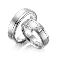 Set trouwringen van acredo in grijsgoud 14 kt. Oppervlakte: gematteerd , gepolijst met in totaal 0,22 ct. Hart-Diamant tw,vs (Product 1 met steenzetting Product 2 zonder steenzetting)