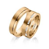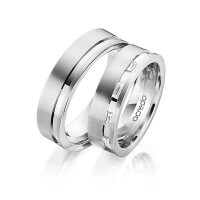 Set trouwringen van acredo in grijsgoud 14 kt. Oppervlakte: gematteerd , gepolijst met in totaal 0,25 ct. Baguette-Diamant tw,vs (Product 1 met steenzetting Product 2 zonder steenzetting)
