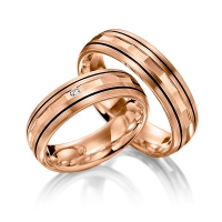 Set trouwringen van Merii in roodgoud 14 kt. Oppervlakte: gematteerd , gepolijst met in totaal 0,02 ct. Briljant tw/si (Product 1 met steenzetting Product 2 zonder steenzetting)