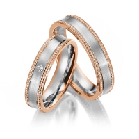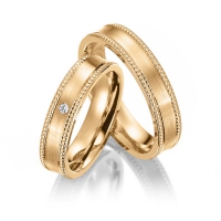 Set trouwringen van Merii in roodgoud 14 kt. Oppervlakte: gepolijst, gematteerd met in totaal 0,02 ct. Briljant tw/si (Product 1 met steenzetting Product 2 zonder steenzetting)