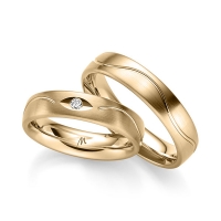 Set trouwringen van Merii in roodgoud 14 kt. Oppervlakte: gematteerd met in totaal 0,04 ct. Briljant tw/si (Product 1 met steenzetting Product 2 zonder steenzetting)