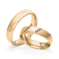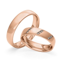 Set trouwringen van Merii in roodgoud 14 kt. Oppervlakte: gematteerd met in totaal 0,072 ct. Briljant tw/si (Product 1 met steenzetting Product 2 zonder steenzetting)