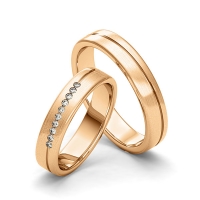 Set trouwringen van Merii in roodgoud 14 kt. Oppervlakte: gematteerd met in totaal 0,1 ct. Briljant tw/si (Product 1 met steenzetting Product 2 zonder steenzetting)
