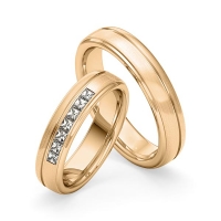 Set trouwringen van Merii in roodgoud 14 kt. Oppervlakte: gepolijst, gematteerd met in totaal 0,35 ct. Princess-Diamant tw,vs (Product 1 met steenzetting Product 2 zonder steenzetting)