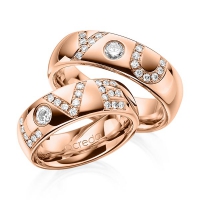 Set trouwringen van acredo in roodgoud 14 kt. Oppervlakte: gepolijst met in totaal 0,955 ct. Briljant tw/si