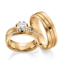 Set trouwringen van acredo in roségoud 14 kt. Oppervlakte: gematteerd , hamerslag met 0,7 ct. + in totaal 0,14 ct. Briljant tw,vs (Product 1 met steenzetting Product 2 zonder steenzetting)