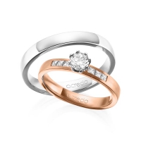 Set trouwringen van acredo in roségoud 14 kt. Oppervlakte: gematteerd met 0,4 ct. + in totaal 0,18 ct. Briljant & Princess-Diamant tw,vs tw/si (Product 1 met steenzetting Product 2 zonder steenzetting)