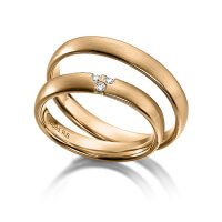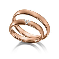 Set trouwringen van acredo in roségoud 14 kt. Oppervlakte: gematteerd met in totaal 0,045 ct. Briljant tw/si (Product 1 met steenzetting Product 2 zonder steenzetting)