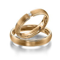 Set trouwringen van acredo in roségoud 14 kt. Oppervlakte: gepolijst, gematteerd met in totaal 0,04 ct. Briljant tw/si (Product 1 met steenzetting Product 2 zonder steenzetting)