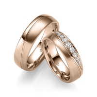 Set trouwringen van Merii in roségoud 14 kt. Oppervlakte: gepolijst, gematteerd met in totaal 0,24 ct. Briljant w,si (Product 1 met steenzetting Product 2 zonder steenzetting)