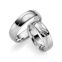 Set trouwringen van Merii in witgoud 14 kt. Oppervlakte: gepolijst met in totaal 0,112 ct. Briljant tw/si (Product 1 met steenzetting Product 2 zonder steenzetting)