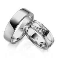 Set trouwringen van Merii in witgoud 14 kt. Oppervlakte: gepolijst met in totaal 0,11 ct. Briljant w,si (Product 1 met steenzetting Product 2 zonder steenzetting)